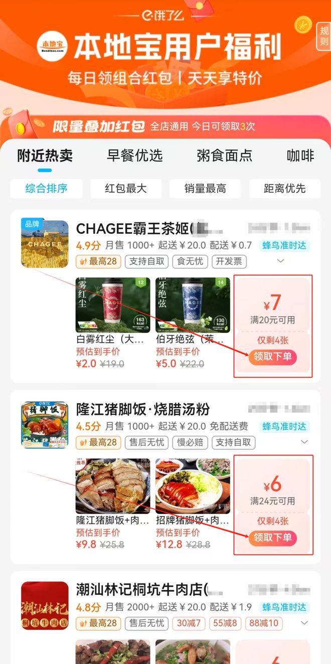 2.进入活动页面,领取店铺专属优惠券(注意券的使用门槛),15分钟内有效,过期可重新领,每单优惠约6-10元。不同定位,优惠力度不同,优惠商家也不同;